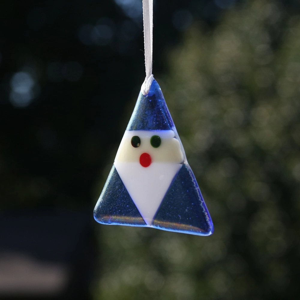 Add a unique touch to your holiday decor with this charming handmade triangular blue glass Santa Claus ornament! Hanging from a white ribbon, Santa sparkles with a slight shimmer from the iridised glass. Perfect for spreading Christmas cheer in a unique and eye-catching way!
