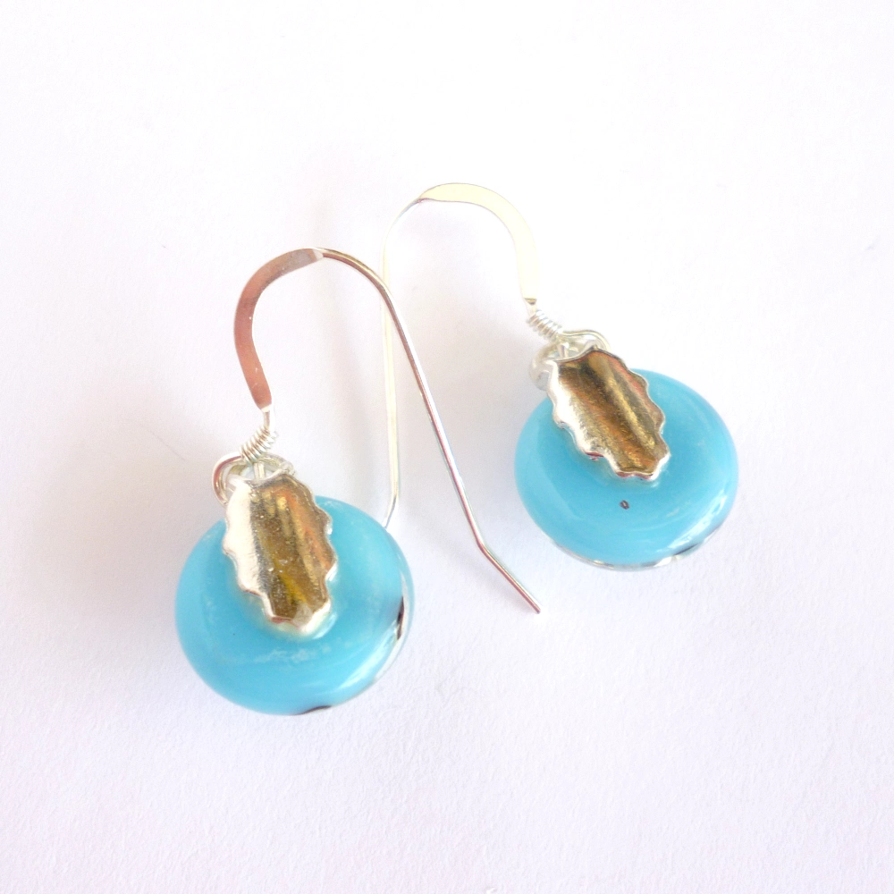 Silver-plated bails attached to custom-fused glass beads and finished with .925 sterling silver flat hook ear wires.