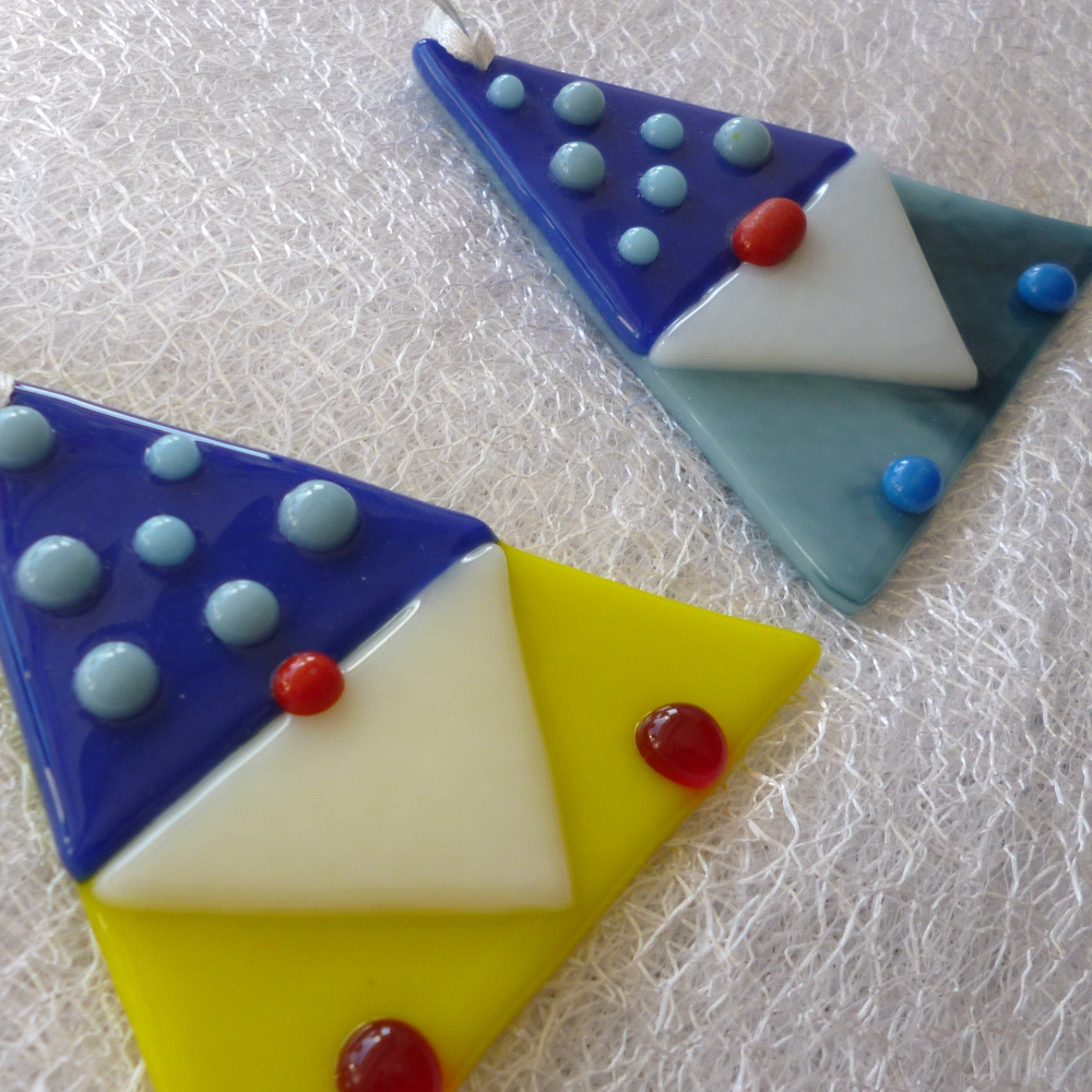 Add a touch of whimsy to your space with these two quirky triangle-shaped fused glass gonks! Hanging from white ribbons, one features a mix of light blue and dark blue while the other showcases a bold combination of dark blue and yellow.
