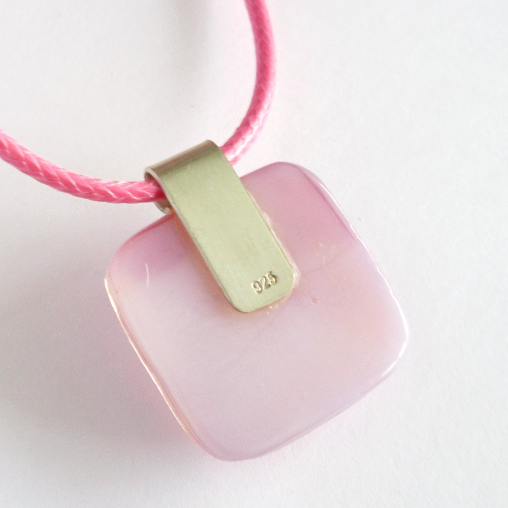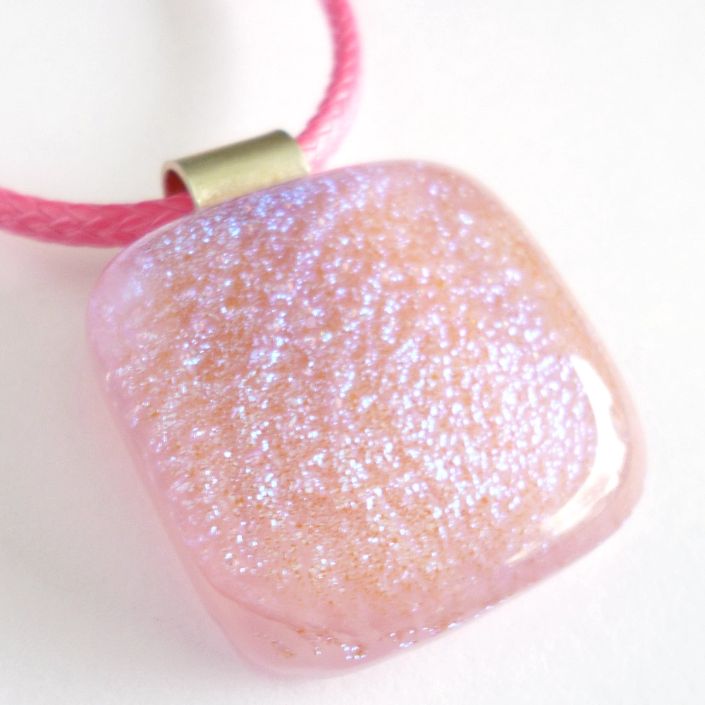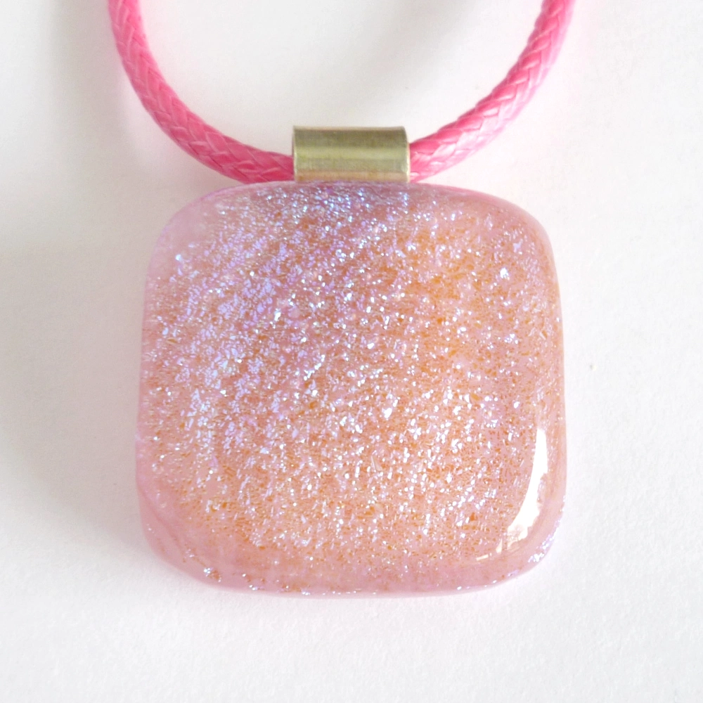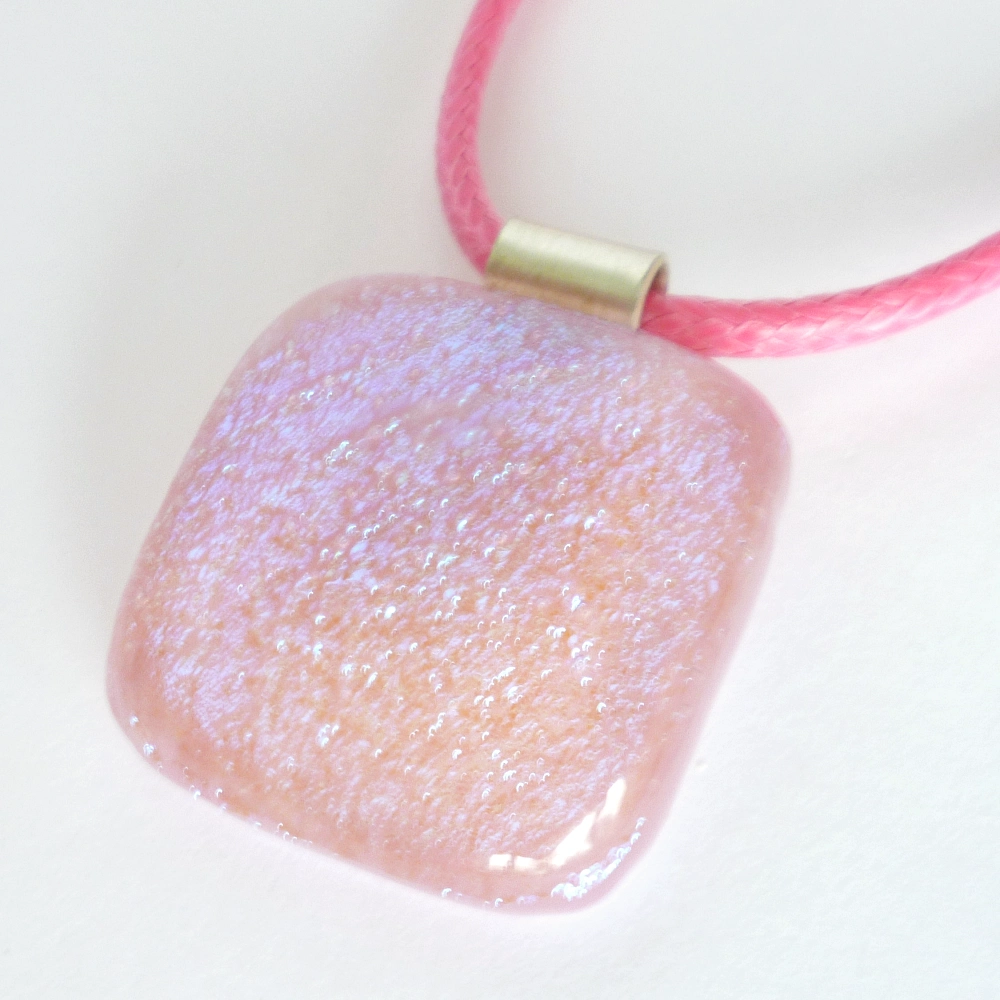 A beautiful pink dichroic glass pendant, made with a streaky pink base glass and layered with dichroic and clear glass. A 925 sterling silver bail attached and hangs from a pink cord necklace.