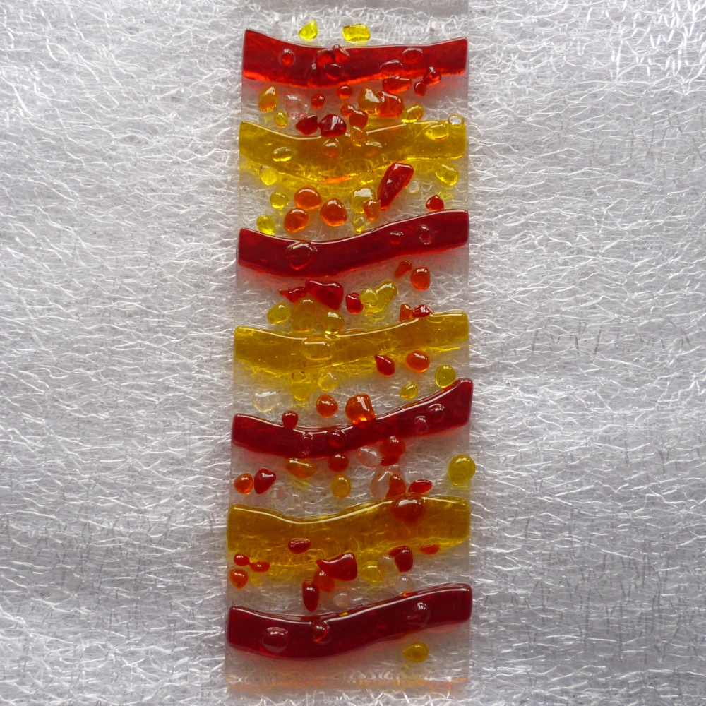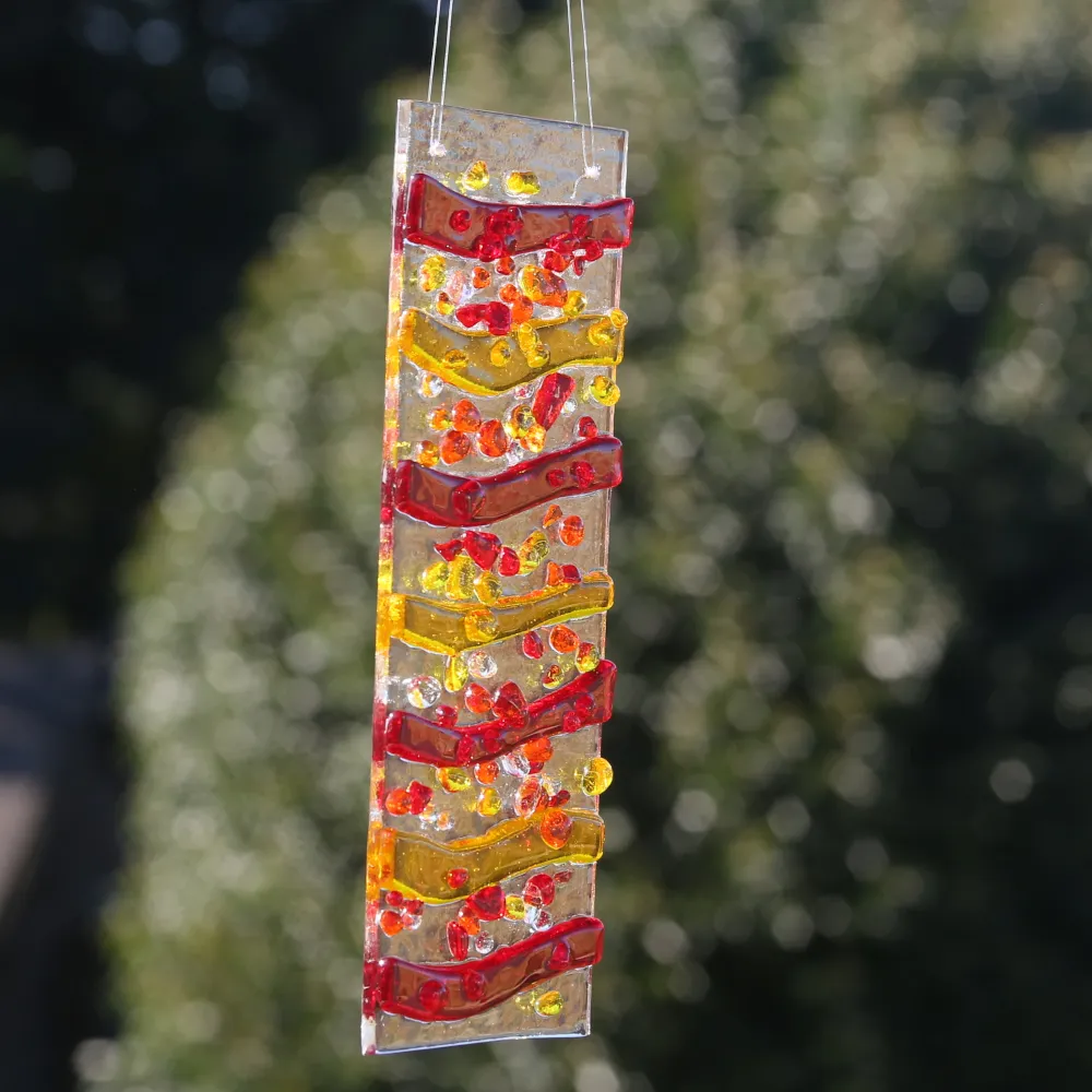 This is a vibrant handmade red, orange, and yellow fused glass wave suncatcher! This eye-catching piece features a tactile design with transparent glass cut into wave shapes, along with frit for added decoration. Hangs from a clear cord, making it perfect for windows or as a unique gift.
