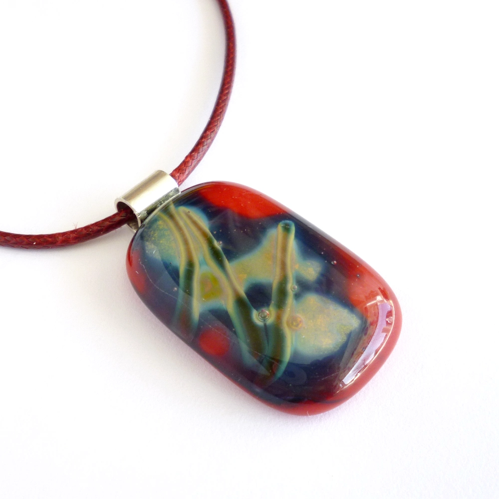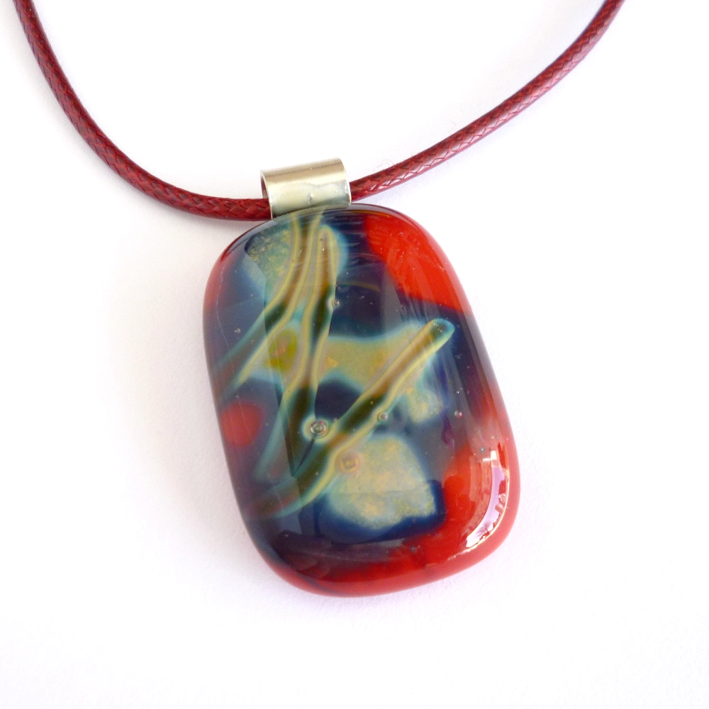 This handmade fused reactive glass pendant features a pattern created using a layered fused glass technique. A base of red glass is combined with reactive glass, alchemy glass and silver foil, capped with clear glass and kiln-fired. During firing, the materials react with each other to create unique patterns and effects that make each pendant individual.