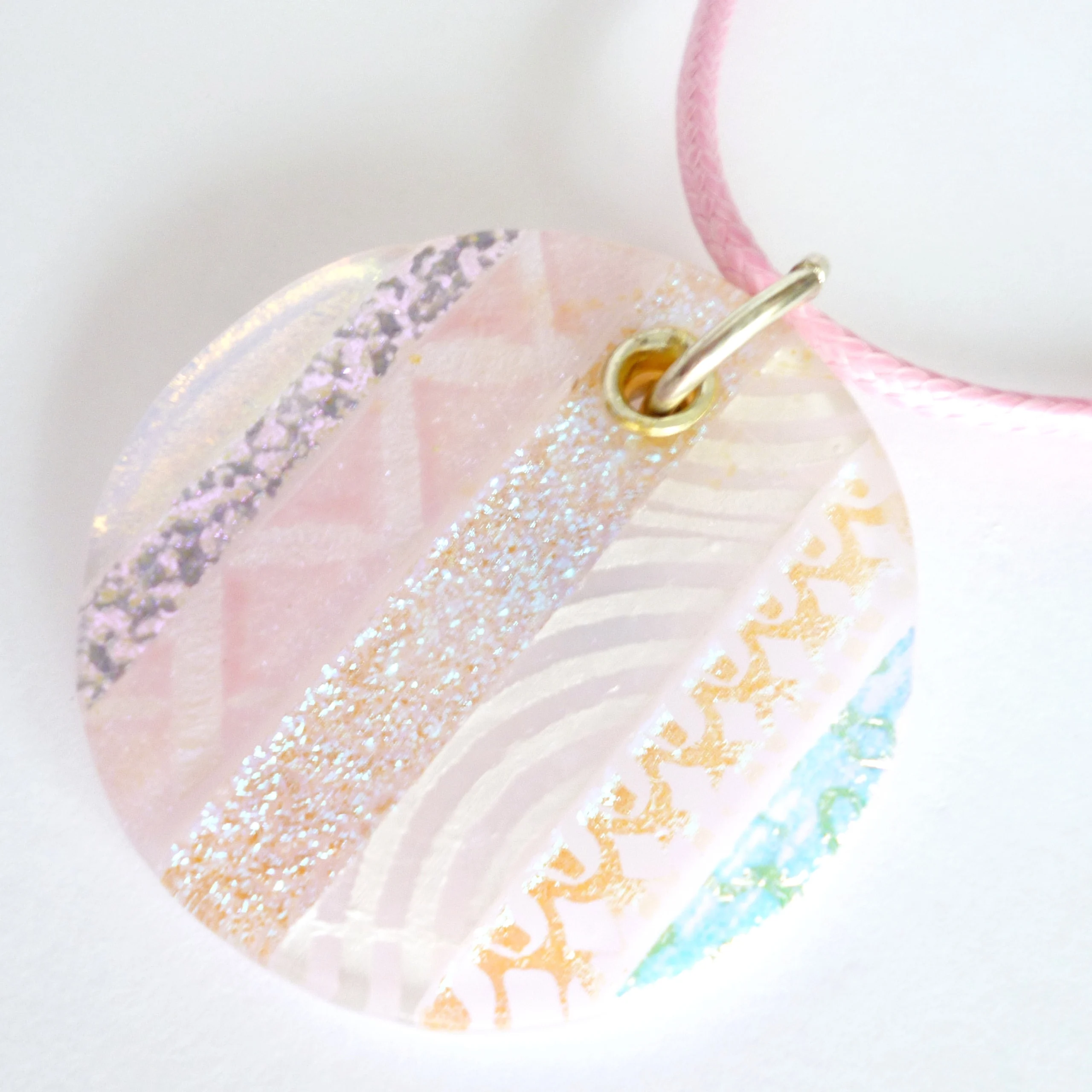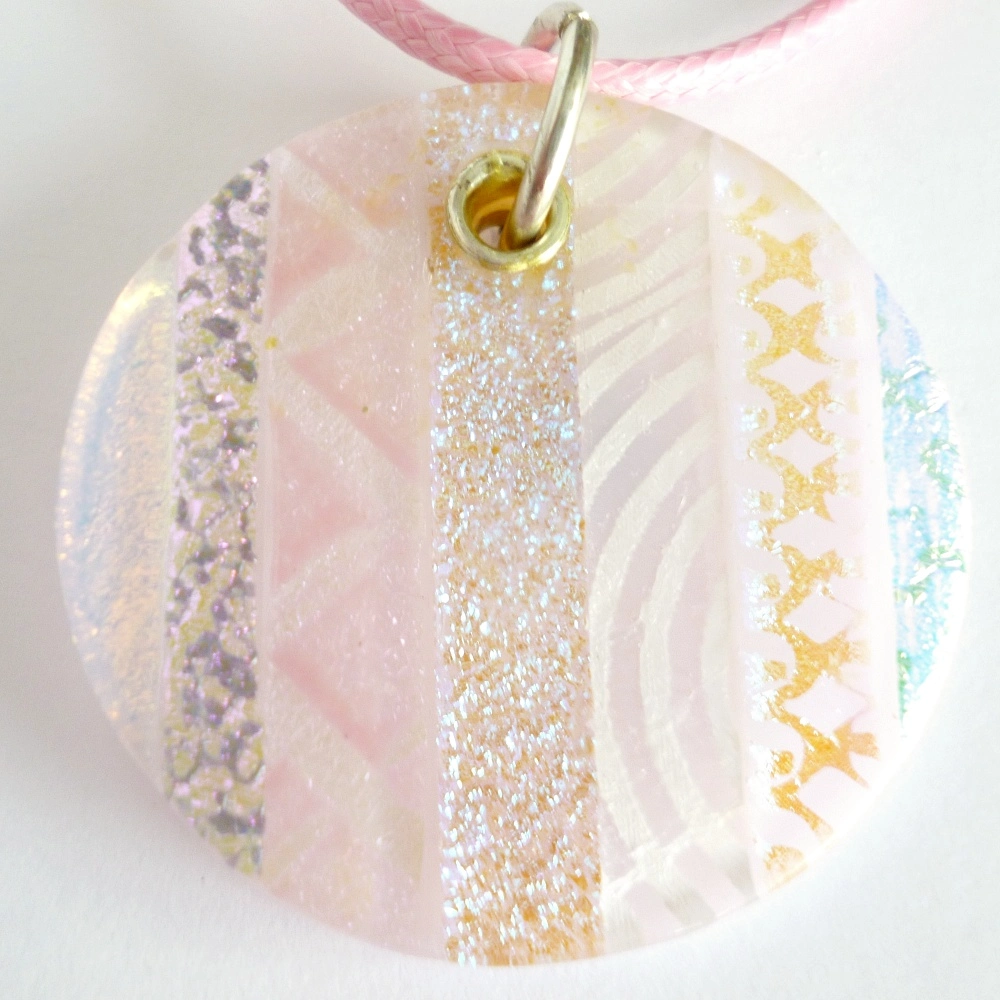 This beautiful large round handmade pale pink dichroic glass pendant is a striking yet elegant piece of statement jewellery. Created using a soft pale pink base glass, it is layered with shimmering dichroic glass and detailed with screen-printed glass to create subtle striped patterns that catch the light beautifully.