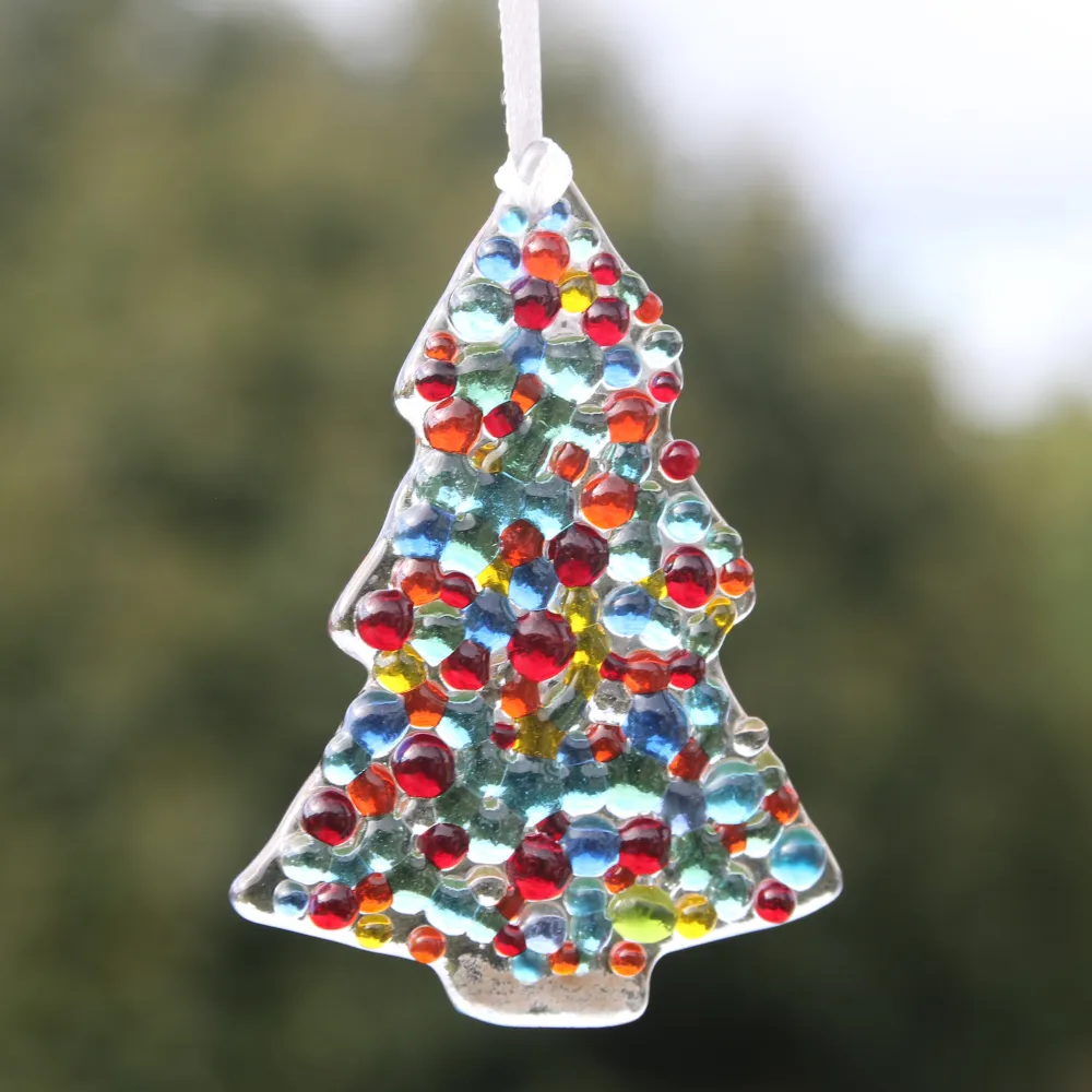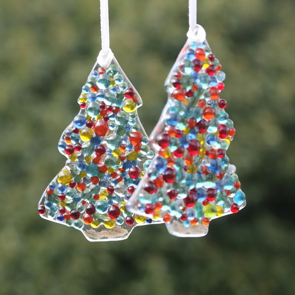 Brighten your holiday season with two small handmade colourful fused glass Christmas tree suncatchers! Each piece features a layer of clear glass with vibrant fused glass beads, creating a display of colour and light. Perfect for windows or festive decor, these suncatchers hang from white ribbons. Ideal as gifts or seasonal accents!