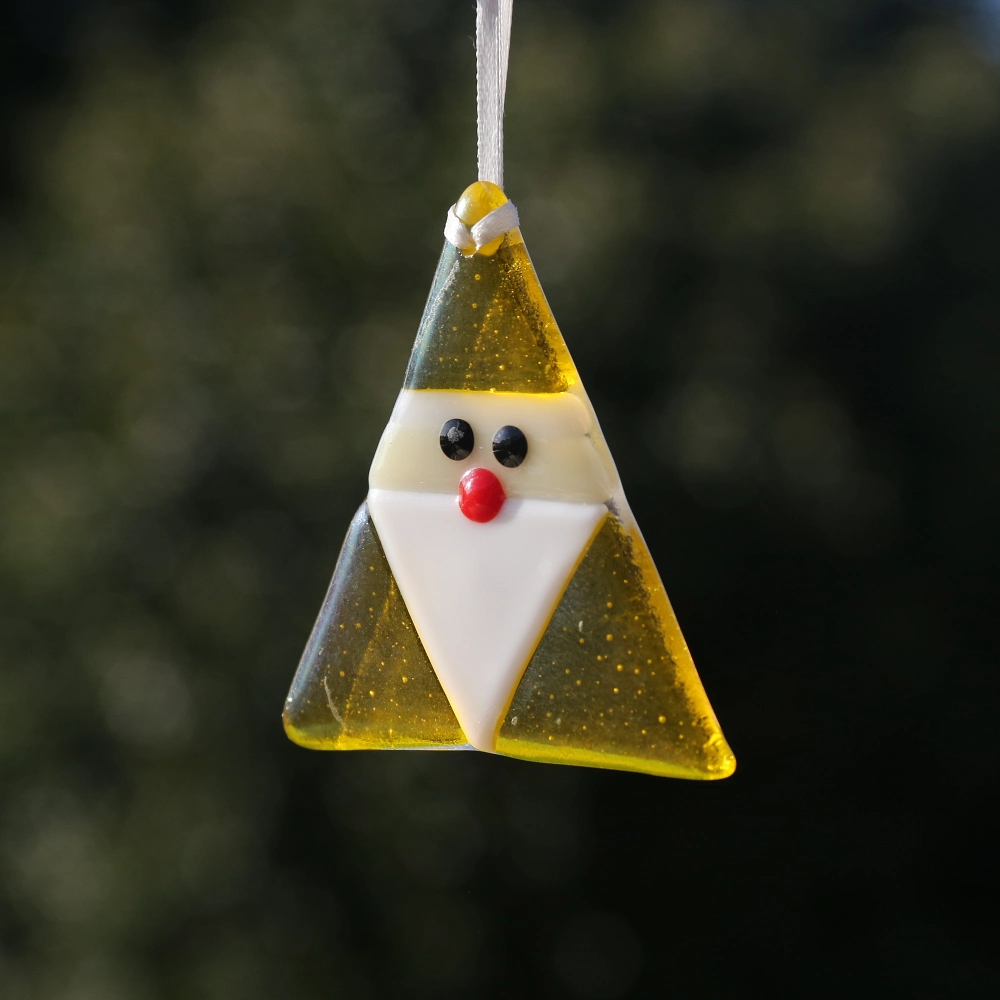 A unique handmade triangle-shaped glass Santa Claus ornament. Crafted from vibrant yellow iridised glass, this quirky Santa features shimmering iridised glass for a festive sparkle. Hangs from a white ribbon. Perfect for adding a fun twist to your Christmas Decorations or as a charming gift for a loved one.